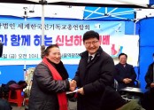 - 세기총. 2019 신년 감사예배 및 하례회 ▲ 반석교회 김진복 목사에게 소중한 성금을 전달하는 대표회장 정서영 목사.