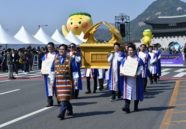 서울 광화문광장에서는 우리나라에 복음이 전해진 지 138년 만에 처음으로 부활절 퍼레이드가 진행됐다. 행인들은 가던 길을 멈추고 스마트폰으로 행렬을 촬영하며 동참했다. 이승희(48·여)씨는 “자녀들에게 우리나라 기독교의 영향력을 보여주고 부활의 기쁨을 전국적으로, 그리고 세계적으로 보여줄 수 있는 행사가 열렸다는 게 감사하다”고 말했다. 호주인 메르시니(41·여)씨는 “기독교인은 아니지만 가족과 경복궁을 구경하러 왔다가 우연히 퍼레이드에 참여하게 됐다”면서 “부활절 달걀도 주셔서 맛있게 먹었다”며 반색했다.
