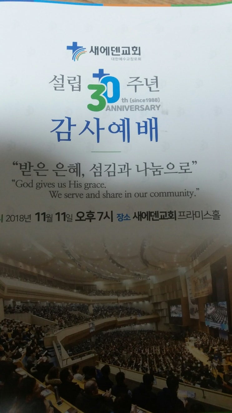 새에덴교회 설립30주년 감사예배 "받은 은혜 섬김 과 나눔으로" 2018년11월 11일 (일)오후7시 장소 새에덴교회 프라미스홀 [담임소강석목사] [기념촬영아시아기독교방송]